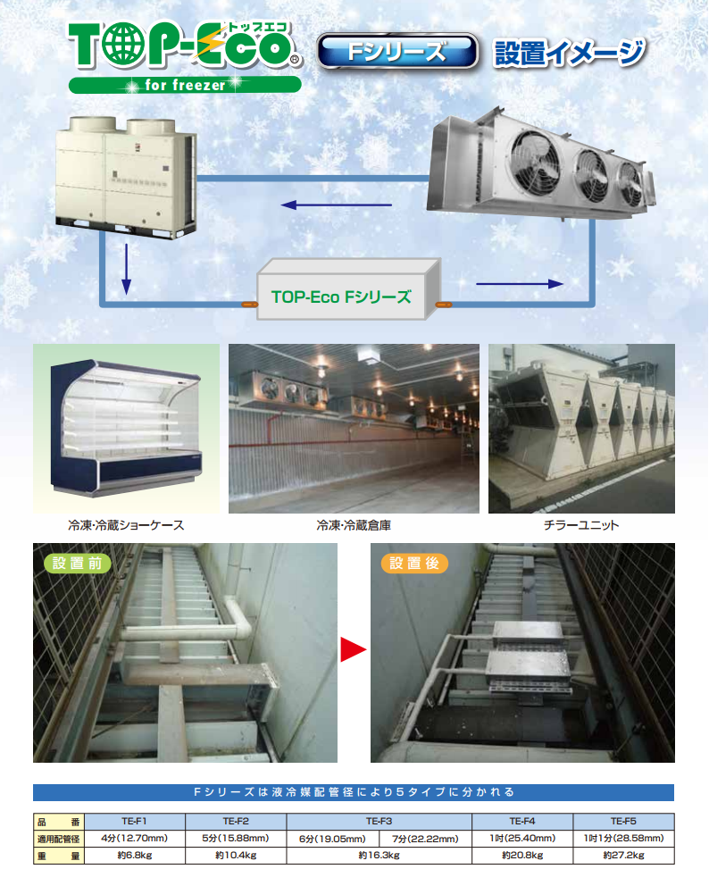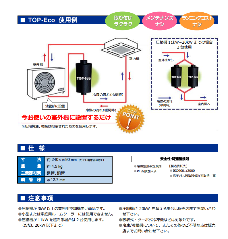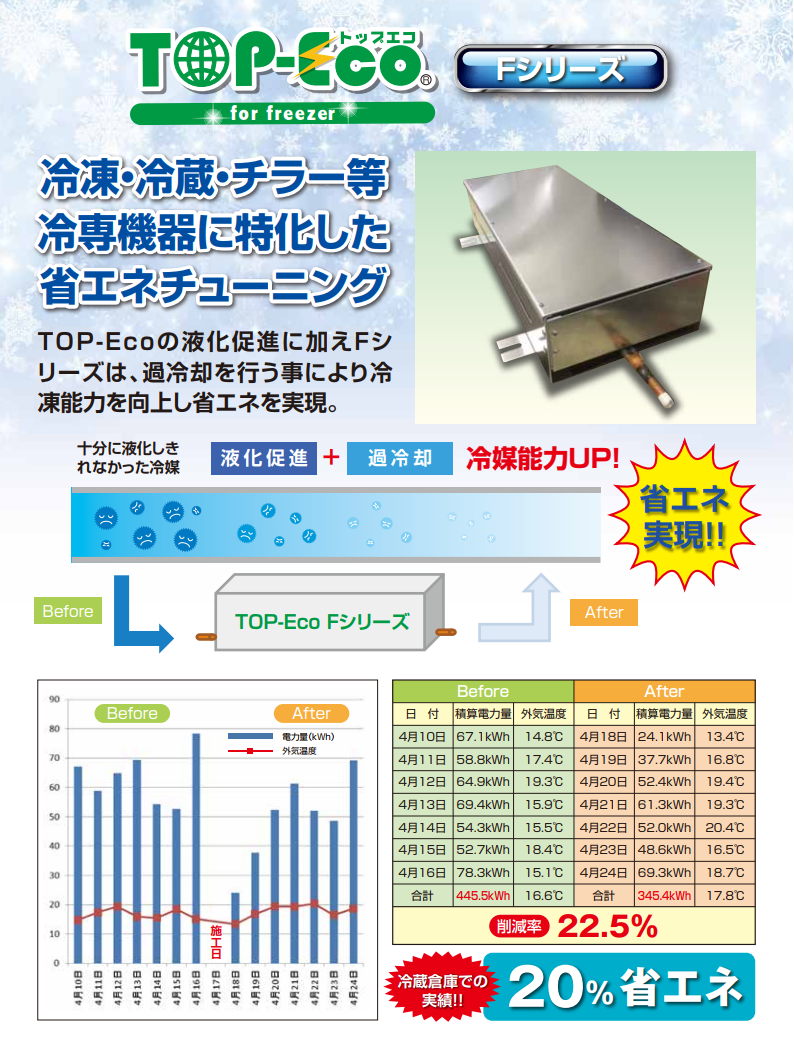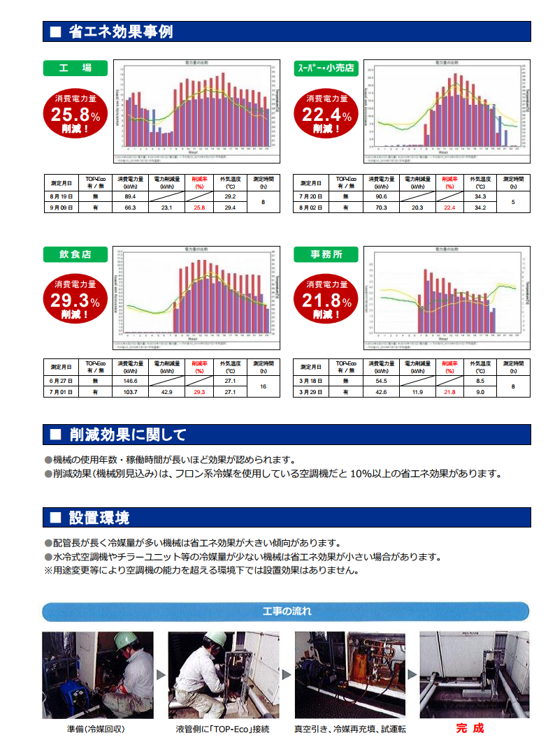 TOP-Eco(トップエコ)シリーズは、冷媒を使用した空調機や冷凍機等を対象とした省エネ装置です。